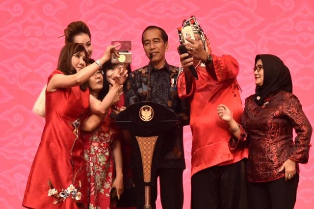 Presiden Joko Widodo menghadiri perayaan Imlek Nasional di Jakarta International Expo Kemayoran, Jakarta, pada Kamis, 7 Februari 2019. Dalam perayaan tersebut, tema yang diangkat adalah "Merajut...
