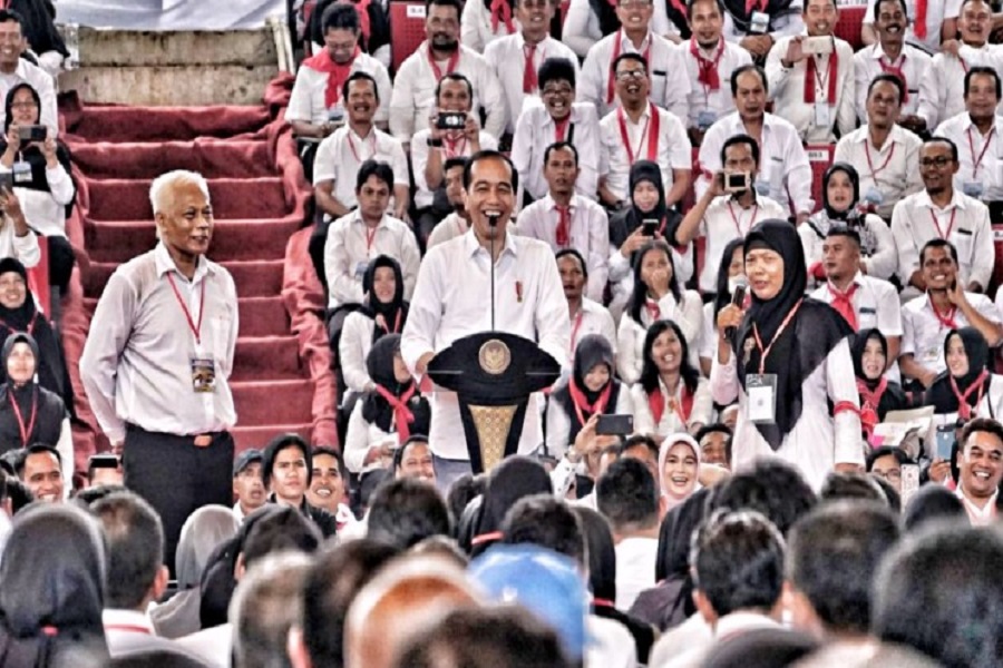 SEMARANG- Presiden Joko Widodo bersilaturahmi dengan ribuan penyuluh pertanian yang berkumpul di GOR Jatidiri, Karangrejo, Kota Semarang, pada Minggu, 3 Februari 2019. Keberadaan para penyuluh...
