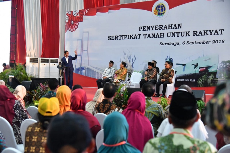 Presiden Joko Widodo menyerahkan secara langsung 5.000 sertifikat kepada masyarakat yang berasal dari tiga kota dan kabupaten di Jawa Timur, yaitu Kota Surabaya, Kabupaten Sidoarjo, dan Kabupaten...