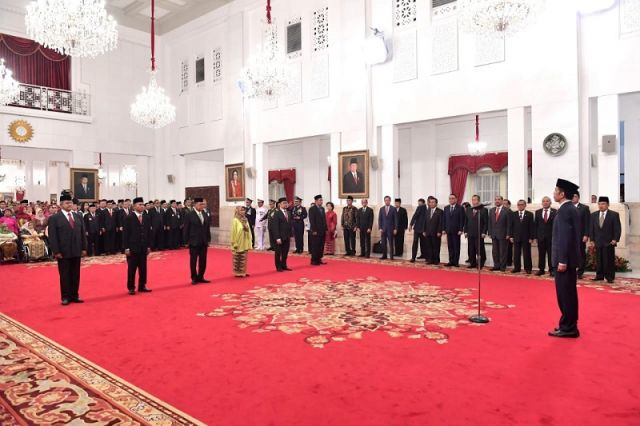 Jakarta, 15 Agustus 2018. Presiden Joko Widodo dengan didampingi oleh Ibu Negara Iriana Joko Widodo mengukuhkan 68 pelajar SMA menjadi anggota Pasukan Pengibar Bendera Pusaka (Paskibraka) di Istana...