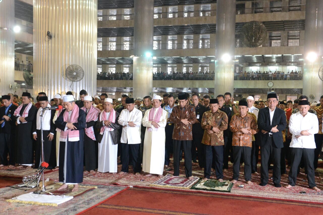 JAKARTA- Presiden Joko Widodo Jumat siang ini menunaikan ibadah salat Jumat di Masjid Istiqlal, Jakarta Pusat. Kedatangannya langsung disambut para jemaah yang telah datang memenuhi Istiqlal.