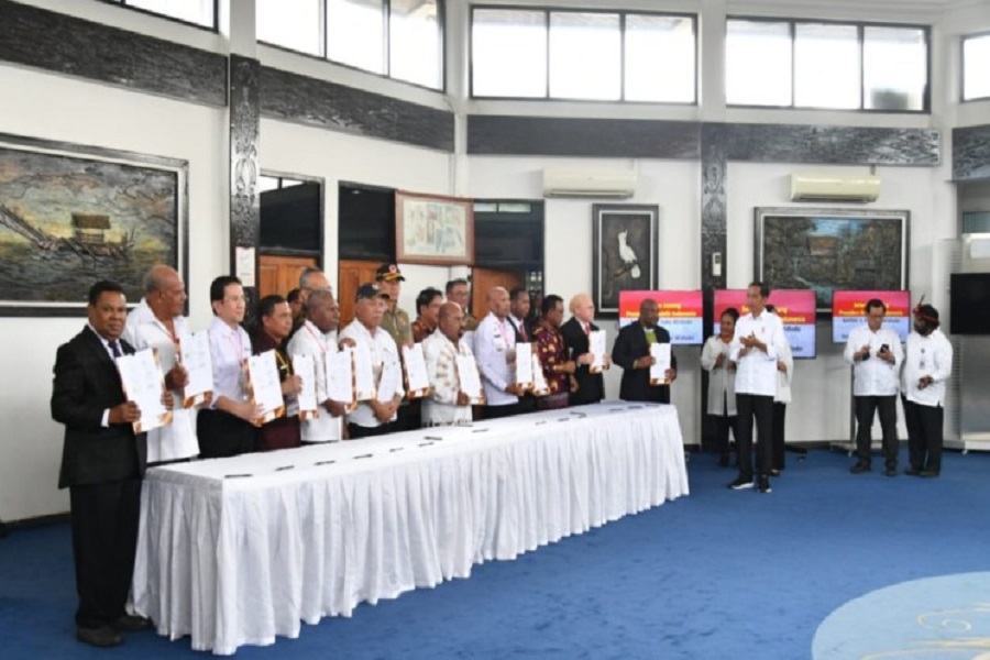 JAYAPURA- Setibanya di Bandara Sentani, Jayapura, Provinsi Papua, pada Senin siang, 1 April 2019, Presiden Joko Widodo beserta Ibu Negara Iriana Joko Widodo langsung menyaksikan penandatanganan nota...