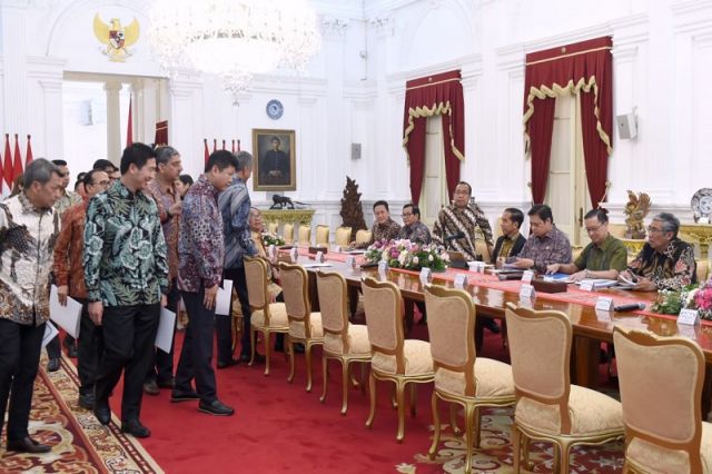 Presiden Joko Widodo bertemu dengan jajaran Asosiasi Pertekstilan Indonesia (API) dan Asosiasi Produsen Serat Sintesis dan Benang Filamen Indonesia (APSyFI), di Istana Merdeka, Jakarta, Senin, 16...