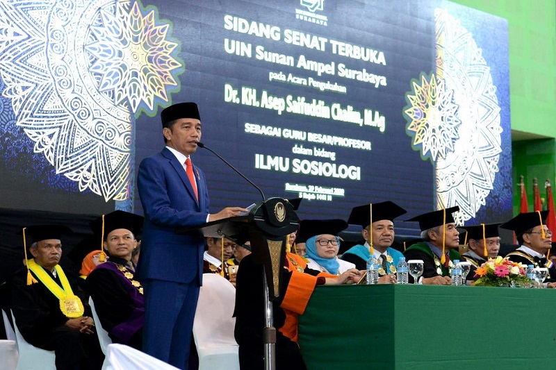 Presiden Joko Widodo menghadiri pengukuhan K.H. Asep Saifuddin Chalim sebagai guru besar bidang sosiologi di Universitas Islam Negeri (UIN) Sunan Ampel. Acara pengukuhan berlangsung di Gedung Sport...