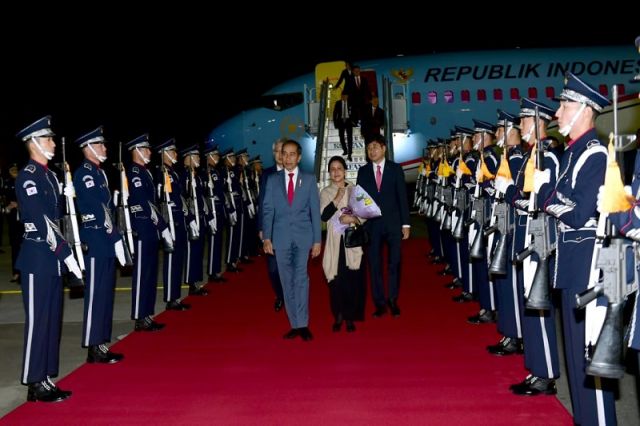 Presiden Joko Widodo dan Ibu Negara Iriana Joko Widodo tiba di Gimhae Air Force Base, Busan, Korea Selatan pada Sabtu malam, 23 November 2019. Pesawat Kepresidenan Indonesia-1 yang membawa Presiden...